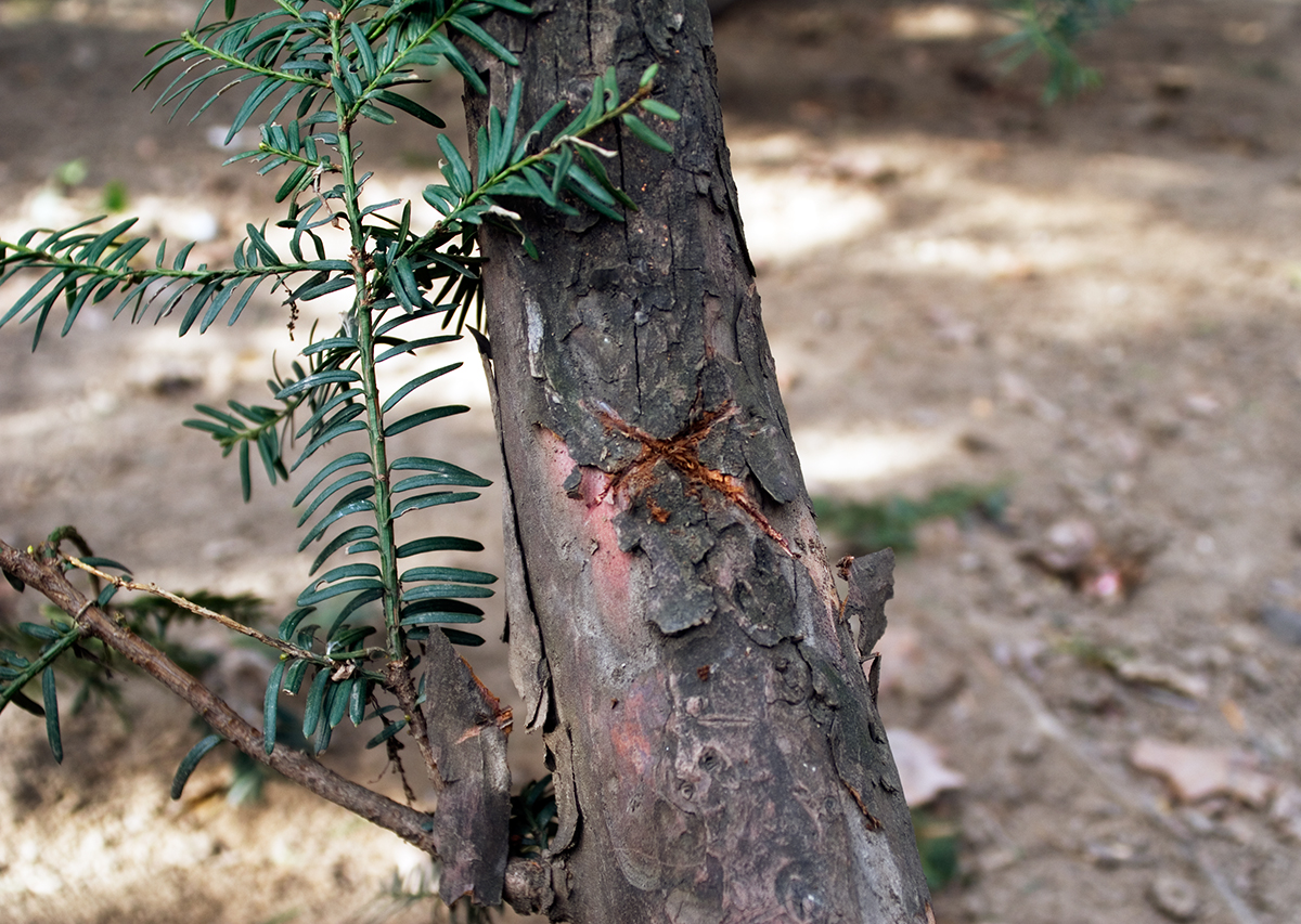 When going away to a place the Artist doesn’t normally inhabit, he buys a disposable camera.This camera is used to record aspects of the journey on route and upon arrival. When all these frames have expired Blackmore finds a quiet location, sheltered by trees to bury the camera. An ‘X’ is marked into the bark of the tree closest to the camera. These cameras will remain buried until when or if the Artist returns.